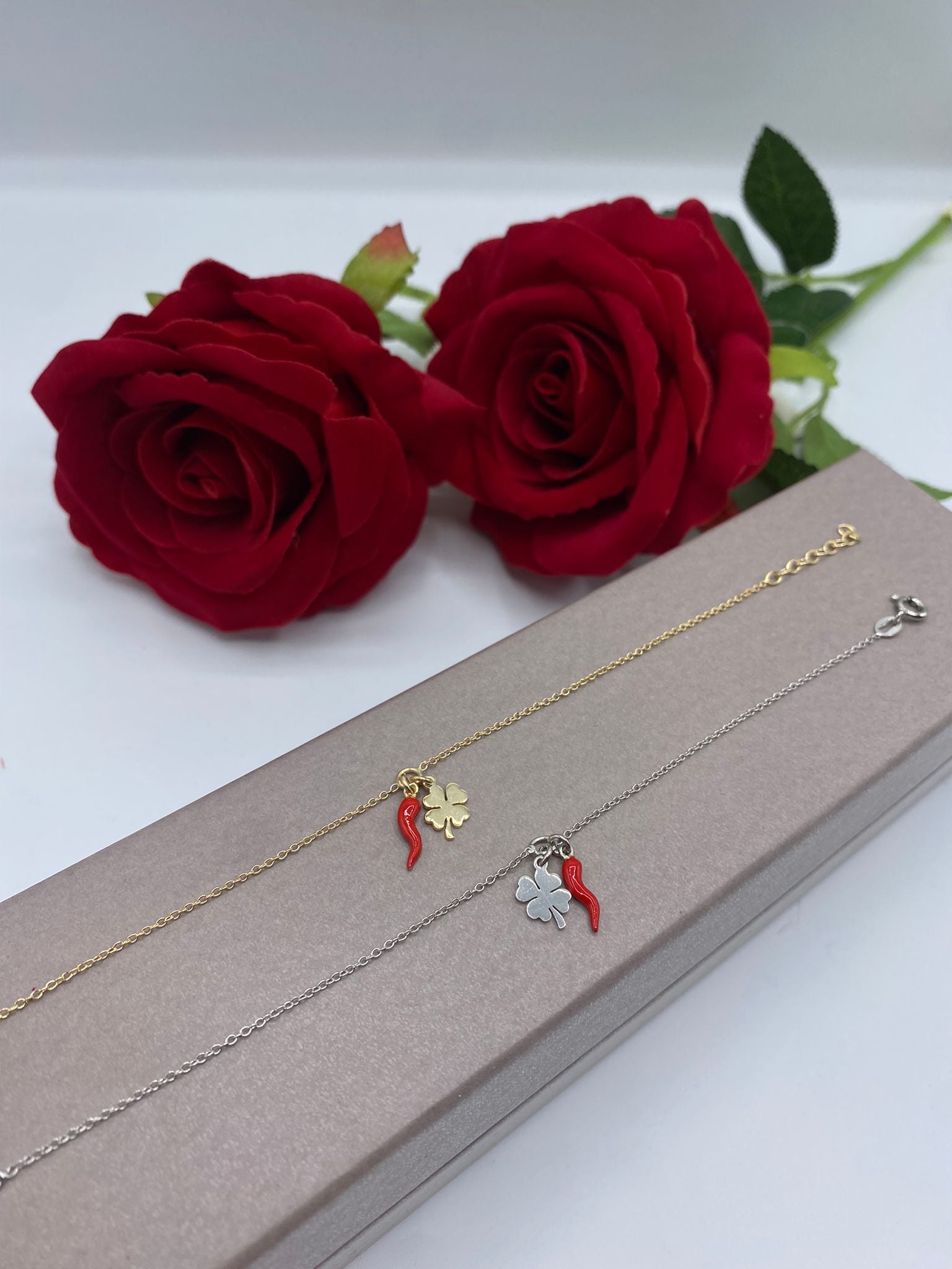 Bracciale 17+3 cm di regolazione con ciondolo corna e quadrifoglio in argento 925.